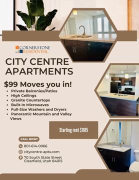 City Centre is a Clearfield Apartment located at 70 S State St. The property features 1 - 2 BR rental units available starting at $1199.