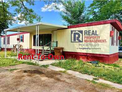 This 2 bedroom 2 full bathroom manufactured home features new paint and flooring throughout, a large yard, and a covered patio with the potential for a bigger deck. Inside there is a bay window in the living room. Off of the living room, there is a full bathroom and a bedroom with a spacious closet. The kitchen has new cabinets and countertops. A new stove, and a fridge. We will not provide a dishwasher. There is another bedroom with a spacious closet and an en-suite bathroom with double vanity.