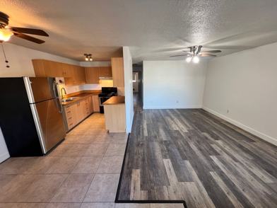 Welcome to your new home at Terrace Court! An open living room welcomes you as you enter, to your left is a dining nook that leads you into the kitchen. There are two closets in the hallway leading towards the bedrooms that provide significant storage. Each bedroom has a ceiling fan and the North facing windows offer you natural light. Have lots of clothes? No problem here, both closets in the bedrooms are large, the one in the big bedroom even being a walk in! The bathroom cabinetry provides additional storage and has a tiled full shower.