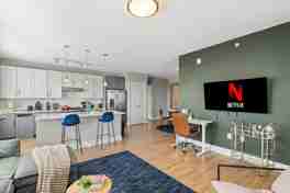 The apartment features a dedicated workstation with a standing desk, perfect for remote work. Fast Wi-Fi at 300+ Mbps ensures seamless streaming, remote work, or video calls.