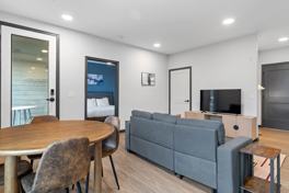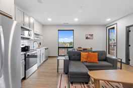 This studio apartment features inviting living areas, a fully equipped kitchen, and a bathroom complete with toiletries. You can also enjoy a resident roof deck, resident clubroom, in-unit washer and dryer, a smart-TV with streaming apps installed, a TV in the living room, and complimentary coffee.
