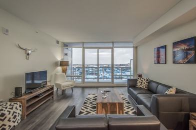 Step into your modern retreat in the heart of Halifax! This stylish two-bedroom apartment offers an open-concept design that seamlessly blends elegance with comfort. Sink into the plush sofa as you take in panoramic skyline views or catch up on your favorite shows with the Smart TV. Channel your inner chef in the fully equipped, contemporary kitchen, outfitted with high-end finishes, ample counter space, and premium appliances. Whether dining solo or hosting guests, every culinary experience is made enjoyable in this modern space. Unwind in the serene first bedroom, featuring breathtaking skyline views, and enjoy the attached bathroom with modern amenities. The second and third bedrooms offer cozy retreats with soft bedding and ample storage space, ensuring restful nights for all guests. A second modern bathroom provides added convenience and comfort.