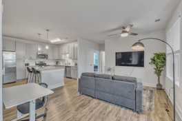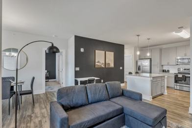 Begin your day with a perfectly brewed cup of tea or instant coffee—decaf or regular—prepared just the way you like it from the convenient coffee station in your upscale kitchen. Whether you're here for business or leisure, this space is designed to provide the perfect balance of comfort and convenience. With vibrant restaurants just minutes away, you might find yourself exploring the culinary scene in Durham each night. Of course, after a long day, it’s reassuring to know that your well-equipped kitchen and elegant dining table are ready to provide a 5-star dining experience right at home. Whether you choose to venture out or stay in, this space serves as the perfect home base for work, relaxation, and entertainment. Step inside and discover an inviting open-concept living area, elegantly furnished to provide a blend of relaxation and functionality. Large windows flood the space with natural light, while modern décor and high-end finishes create a sophisticated yet comfortable atmosphere. The spacious living area is thoughtfully designed with plush seating, a 55” Smart 4K TV, and elegant décor. Fast Wi-Fi (300+ Mbps) is perfect for streaming, remote work, or video calls. Enjoy the smart TV with streaming services like Netflix, Hulu, and HBO Max (login required). Self check-in is seamless with a keyless smart lock, and a dedicated work station with a standing desk is perfect for remote work. The apartment also includes an in-unit washer and dryer with energy-efficient laundry appliances.