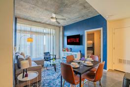 The open-concept layout brings the living, dining, and kitchen areas together for a clean, modern, and effortless living experience. The living room offers a sofa bed, a 55" 4K HDR smart TV, and a coffee table. The fully equipped kitchen has a microwave, stove and oven, refrigerator/freezer, dishwasher, toaster, coffee maker and essentials, electric kettle, hot and cold water, glassware, silverware, and pots and pans. The bedroom offers a queen-size bed with fresh linens, an office desk and chair, and reading lamps. The bathroom is stocked with a shower/tub, wash basin and mirror, toilet, towels, hand towels, washcloths, and basic toiletries.