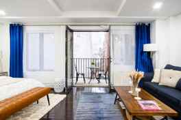 Experience modern city living in this beautifully renovated, fully furnished 1-bedroom apartment located in the heart of Hell’s Kitchen (Midtown West). Designed with sleek, contemporary furniture, this stylish unit features a spacious layout. Enjoy breathtaking city views through large windows or step onto the Juliet balcony for a breath of fresh air. The apartment boasts a fully equipped kitchen with all essential appliances, cookware, and tableware. Washer and dryer in unit, 43' smart TV, and high-speed Wi-Fi make it perfect for both short- and long-term stays. Additional comforts include fresh towels, heating, air conditioning, and an abundance of natural light. Set in a well-maintained elevator building with only two apartments per floor, you’ll enjoy privacy and tranquility while being in the heart of one of NYC’s most exciting neighborhoods.