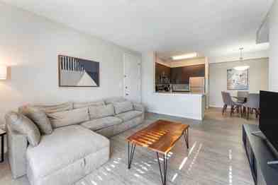 This apartment features two bedrooms, with Bedroom 1 offering a queen bed and Bedroom 2 providing two twin beds. It includes two full bathrooms, an open-concept living and dining area, and a fully equipped kitchen with a coffee maker. High-speed Wi-Fi is available, with the router located in the master bedroom closet, and there is an in-unit washer and dryer for your convenience.