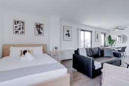 Step into this bright and modern apartment, designed as your stylish and comfortable home away from home. Relax on a plush sofa bed, perfect for unwinding after a day of exploring or accommodating an extra guest. Step outside to your private balcony and enjoy morning coffee or sunset views. The bedroom features a queen-size bed with premium linens for a restful night's sleep. Cook with ease using modern appliances and all the essentials you need for breakfast, lunch, or dinner in the equipped kitchen. Refresh in a sparkling clean modern bathroom stocked with starter toiletries for your convenience.