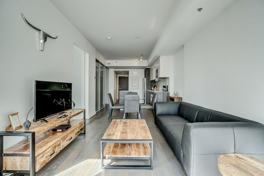 Enter a bright and spacious living room, thoughtfully curated as a peaceful retreat from the city's hustle and bustle. Elegantly appointed with a cozy sofa, chic center table, and a large TV, this welcoming space is ideal for relaxation. The kitchen is a dream for culinary enthusiasts, seamlessly blending stylish design with practical functionality, including ample counter space and top-of-the-line appliances. The bedroom boasts a luxurious queen-size bed and offers a panoramic view, enhancing the sense of openness. The bathroom is outfitted with a chic vanity and a soothing standalone shower.