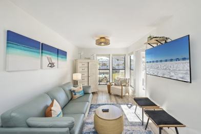 Anchors Up is a second-floor two-bedroom, two-bathroom condo in the sought-after Sandpiper Cove Resort. Enjoy a cool beverage right outside your living room overlooking a hole of the 9-hole course. Inside, there's plenty of space with a full kitchen, dining table for four, and a breakfast bar with seating for two in an open-concept layout. Relax on the trendy vinyl sofa that converts to a queen-size bed with a top-of-the-line commercial-grade mattress. The spacious master bedroom features an en-suite bathroom, while the second bedroom offers two twin bunks.