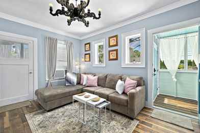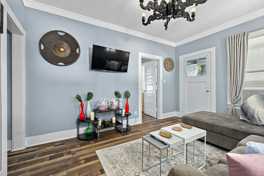 This recently renovated apartment, full of historic charm and modern updates, welcomes you with a living room that exudes an earthy and retro beachy atmosphere. Relax with a smart TV loaded with Netflix or prepare meals in the fully equipped galley kitchen, complete with utensils, cookware, and various appliances like a microwave, Keurig, and toaster. The apartment includes three bedrooms: a private room with a queen bed, a room with a full bed and sitting area, and a spacious bedroom with a king bed and an en-suite bathroom. Both bathrooms feature walk-in showers and are stocked with essentials like shampoo and conditioner. Enjoy the Florida sun on the front porch with a cup of coffee or an evening cocktail.
