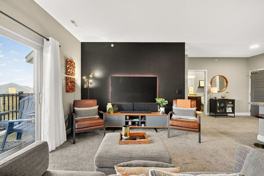 The open-concept living area features a plush sofa, designer leather accent chairs, and a 65" smart TV with full surround sound. The fully equipped kitchen boasts a large island with seating and modern appliances. Each of the two bedrooms features a king-size bed, a smart TV, and room-darkening curtains. The bathrooms offer large vanities with ample storage, updated fixtures, shampoo, body wash, conditioner, body towels, hand towels, washcloths, hair wraps, make-up towels, and a hair dryer with attachments. A dedicated laundry room with a washer and dryer makes longer stays seamless and stress-free, with laundry supplies included, such as an iron, ironing board, and drying rack.