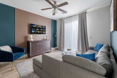 The apartment is designed with everything you need within easy reach. Interior features include carpet and hardwood floors, high ceilings, ceiling fans, Wi-Fi access, and a Smart TV. The bathroom offers a shower with a full-sized tub, complimentary toiletries, and a blow dryer. The bedroom is equipped with a super comfort queen memory foam mattress, cedar-lined closet, luggage racks, and plenty of outlets for all your electronic devices. The kitchen is fully equipped with full-sized appliances, a microwave, coffee maker with complimentary coffee, toaster, blender, food processor, pots and pans, and basic spices for cooking.