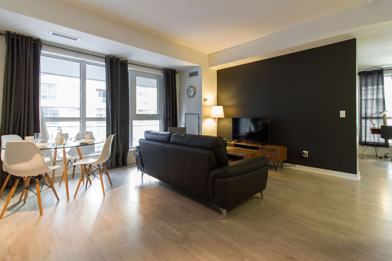 Step into your sophisticated urban sanctuary in the heart of Toronto. This beautifully curated living space flows effortlessly into an open-concept kitchen and dining area, framed by mesmerizing skyline views. Lounge on the plush, designer sofa, catch a movie on the Smart TV, or simply marvel at the panoramic cityscape right from your living room. The sleek, gourmet kitchen is outfitted with premium appliances, ample counter space, and refined finishes, ideal for everything from quick bites to elaborate meals.