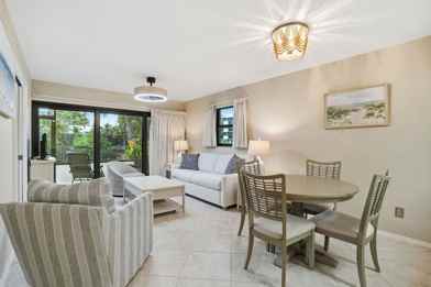 This condo features a king-size bed in the main bedroom and a pull-out sofa in a room with direct lanai access. The large sliding doors in the back open to the open lanai. Enjoy access to the heated swimming pool, sports facilities including tennis and pickleball courts, a fitness center, lakefront walking paths, an island gazebo with barbecue grills, and on-property dining at Hogfish Harry's Restaurant & Bar.