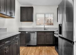 Beautiful fully remodeled showplace in desirable, secure building. Spacious one level end unit set off the street in quiet interior location. Move-in ready. Light, bright, open living room with hardwood floors, crown moldings, and a cozy fireplace. The gourmet kitchen is complete with all-new cabinets, countertops and appliances. Newly tiled bathroom with updated vanity, lighting and glass enclosed shower door. Large bedroom with custom walk-in closet. New paint, mini blinds and light fixtures. New AC units. Assigned, gated covered parking...Great location...Close proximity to Century City, Westwood, and W.L.A..