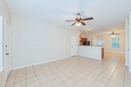 This floor plan creates a compromise between the first two – pantry and island kitchen with granite counters, dining area flowing to kitchen, and living room distinctly separate. Recessed lighting and multiple window designs allow interesting natural light patterns.