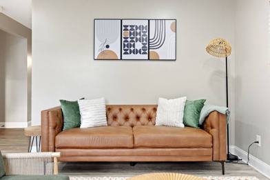 Step inside a warm and inviting open layout featuring a stylish living area with a caramel-leather sofa, sage-green accents, and abstract art. The fully equipped kitchen features quartz countertops, stainless steel appliances, and a breakfast bar. There are 2.5 bathrooms, stocked with essentials and fluffy towels. A washer and dryer are available for longer stays.
