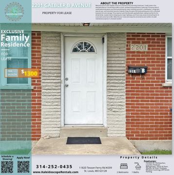 Welcome home to 2201 Gaebler Avenue in Overland! This charming 2-bedroom, 1-bath home in the desirable Ritenour School District offers a fresh, updated living experience. Featuring 710 square feet of comfortable living space, you'll find everything you need, including central AC, a dishwasher, refrigerator, stove & oven, and convenient laundry hookups. Enjoy the ease of off-street parking and a full, unfinished basement for extra storage. This property is pet-friendly (with applicable fees), making it perfect for the whole family. Located close to shopping and major highways, you'll have easy access to everything the St. Louis metro area has to offer. Make this your home and enjoy the convenience and comfort of a well-maintained property in a fantastic location!