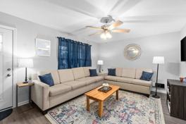 The first home features a living room with a large flat-screen TV complete with Roku, two couches including a queen-sized sleeper sofa, and an eat-in kitchen with stainless steel appliances. Bedroom one has a queen-size bed and a futon, while bedrooms two and three each have queen-size beds. Two full bathrooms, a half bath, and a laundry room complete the interior. The second home features a living room with a large flat-screen TV complete with Roku, two couches including a queen-sized sleeper sofa, and an eat-in kitchen with stainless steel appliances. Bedrooms one and two both have queen-sized beds, and bedroom three has two full beds. Two full bathrooms, a half bath, and a laundry room complete the interior.