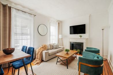 This 1-bedroom apartment is fully furnished with all the amenities and necessities for an extended stay. The kitchen is fully equipped with high-end appliances and cookware. The living room features a plush couch and a 50” smart TV, while the bedroom offers a queen-size bed. High-speed wireless internet is included for your convenience. An air mattress is available free of charge to accommodate a third guest.