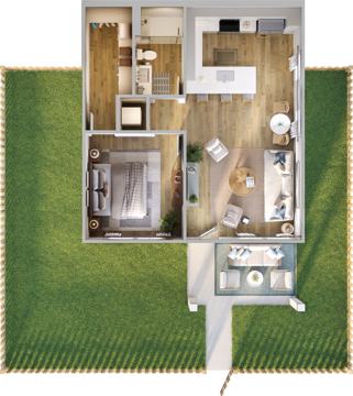 Discover our A2 Floor Plan – a beautifully designed 1-bedroom, 1-bathroom layout offering 728 sq. ft. of stylish living space and a fenced in private front yard. Each apartment features sleek stainless steel appliances, a full-size washer and dryer, and upscale finishes throughout for a modern, comfortable lifestyle.