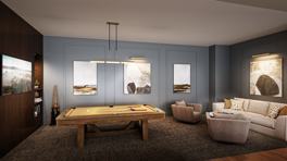 Community Amenities: Fitness room & yoga studio with backlit mirrors; sauna with changing suite; lobby with complimentary coffee bar, flex work/lounge space, double-sided gas fireplace, and pool table; mail room and secure package room with full-size commercial beverage center; lounge with kitchenette; fenced dog run and pet spa; resident storage; fifth-floor sky lounge with outdoor patio, fire pit with lounge area, grill and prep station, and terrace.