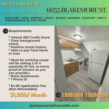 Welcome to 6633 Blakemore St., a charming 1-bedroom, 1-bath apartment located in the desirable East Mt. Airy section of Northwest Philadelphia. This first-floor unit offers both comfort and convenience, featuring beautiful hardwood floors that add warmth and character throughout the space. The kitchen is equipped with clean white appliances, creating a bright and functional area for everyday cooking. The tiled bathroom includes a full tub, perfect for relaxing after a long day. The bedroom is well-sized, offering a cozy retreat with enough space to make your own. Situated just a few blocks from Pleasant Playground, you'll enjoy easy access to outdoor recreation and a peaceful neighborhood feel. With its prime location and practical layout, this apartment is perfect for anyone seeking a comfortable and affordable place to call home. Rent is $1,050 per month—don't miss out on this great opportunity! $1,025/ Month $2,050 move in Requirements: * At least 550 Credit Score * Clear background check * Positive rental history * Able to pay Total Move In Cost * Must be working cause will be asking 2 or 4 paystubs (If not, as many proof of income as you can provide.) * 1 Photo ID * $4.99 Application Fee (Non Refundable)