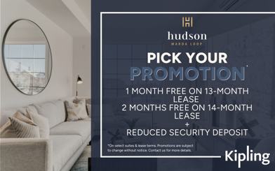 Pick Your Own Promotion: Choose a 1 month free on a 13-month lease OR 2 months free on a 14-month lease plus reduced security deposit!