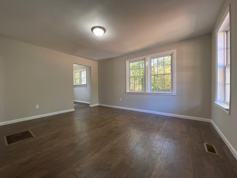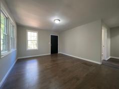 Renovated 2 bed, 1 bath duplex with wood-style floors, a bright living area, updated kitchen with black appliances, and carpeted bedrooms. The bathroom is modern, and the home features fresh paint and a welcoming front porch.