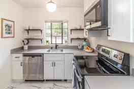 This unit has 2 bedrooms and 1.5 bathrooms. The guest bedroom does not have a closet. It boasts refinished kitchens with stainless steel appliances, including a range/oven, garbage disposal, dishwasher and built-in microwave, quartz countertops, and updated bathrooms.