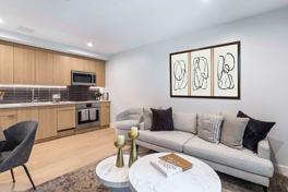 Vivre offers elevated finishes typically found in luxury condominiums. Interior features include floor-to-ceiling windows, wide-plank wood flooring, stainless steel appliances, quartz countertops, recessed lighting, full-size washer & dryer, fully controllable HVAC, custom window shades, fob-access electronic entry, full-size walk-in showers or soaking tubs, and private balconies in select homes. Kitchens feature custom woodgrain cabinetry, Bosch appliances with custom penalization, sleek exterior-venting hoods, under-cabinet lighting, and full-height designer backsplashes. Residents enjoy a concierge to assist with packages, a Wi-Fi-enabled penthouse-level interior lounge, and a rooftop deck with city views.