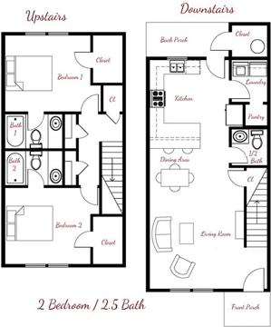 Pinecreek Villas is located on the North Side of Tifton, and are 2 bedroom 2.5 bath two story townhouses with 1210 squarefeet. They have a storage room on the back patio and ample closet space. These townhouses include high-speed internet, lawn maintenance, and garbage