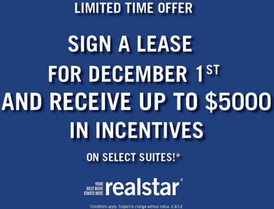 Sign a lease for Dec. 1st and receive up to $5000 in cash incentives (on select suites)*