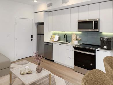 This brand new apartment is thoughtfully designed offering a comfortable and convenient living space. This apartment features warm ash vinyl flooring throughout with large windows providing natural lighting. The modern kitchen is equipped with brand new stainless steel appliances and features a warm tone backsplash. The in-unit laundry facilities provide added convenience. Stay comfortable year-round with central air conditioning and heating, ensuring a pleasant living environment no matter the season. Step into the courtyard and enjoy a breath of fresh air, perfect for relaxing or socializing with friends. With an awareness of the vibrant, surrounding neighborhood, the builder took great care to provide high-quality windows and walls to provide a relaxing home environment.