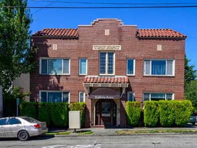 Built in 1928, in the heart of Fremont, DeSoto Arms offers 10 large studios and 4 one-bedroom units. All apartments boast coved ceilings, oak hardwood floors, glass-handled doorknobs, classic textured walls, wide floor molding, original period bath floor tile, and refinished deep iron bathtubs. The top-floor, western-facing units also offer views of the Ship Canal, Ballard, and fisherman’s terminal. The building showcases its vintage beautifully, with beautiful symmetry, several stunning stained-glass windows, and wide interior corridors featuring coved ceilings and beautiful original wall sconces for lighting.