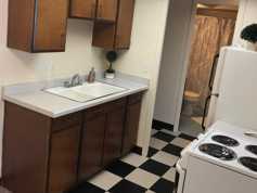 Apartment interiors include a galley kitchen with a range and refrigerator, several windows to brighten up the living area, walk-in closets and ceiling fans.