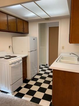 Apartment interiors include a galley kitchen with a range and refrigerator, several windows to brighten up the living area, walk-in closets and ceiling fans.