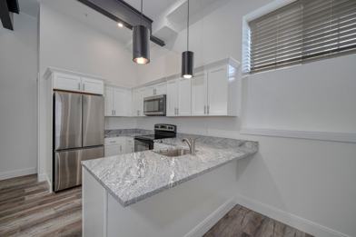 Inside, you're greeted with an expansive layout highlighted by 14-foot ceilings in select units and exposed beams, adding character and spaciousness. The contemporary kitchen features stainless steel appliances, white shaker cabinet and a convenient eat-at breakfast bar. Practicality meets style with an in-unit washer/dryer, vinyl plank flooring for easy maintenance, and a smart mirror in the bathroom for a modern touch.