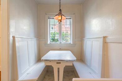 This delightful studio is situated in a garden courtyard. It has a front and back door going directly to the outside, making it feel more like a cottage than an apartment. The kitchen is separate from the main living space and features tall cupboards and a breakfast nook with built-in table and benches that open for storage. Additionally, hardwood floors, large sash windows, and a large walk-through closet make this charming studio an ideal home.