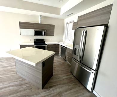 Chef’s Kitchen: Features custom cabinetry, quartz countertops, a subway tile backsplash, and a full suite of stainless steel appliances (including dishwasher and microwave).