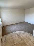 This floor plan has carpet in the living room and both bedrooms, tile is in the kitchen and dining area, a stove, and a fridge.