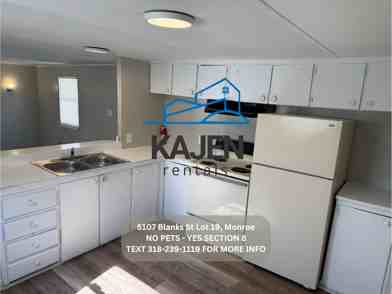 -Text (318) 239-1119 "viewing instructions Lot 19" We will then send you the instructions to do a self showing. -Yes Section 8 -No Pets -No rent to own -No smoking inside -Rent is $675.00 -Deposit is $530.00 -Water is $50.00 -Income will be verified on each tenant. -We provide 3 window units for Heat and AC. -Located at 5107 Blanks St Lot 19 Monroe, LA -Stove and refrigerator are included. -2 bedroom 1 bath mobile home. -You pay utilities (electric, $50/water) -We pay trash and lawncare. -Washer and Dryer connections. -Home is all electric. -$50 application fee per adult.