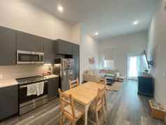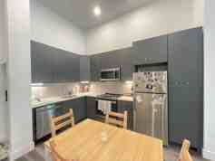 Enter the apartment to an open kitchen/living room layout. The kitchen features stainless steel appliances, quartz countertops, and plenty of cabinet space. The kitchen includes a full size electric range, dishwasher, built in microwave, garbage disposal, and full size refrigerator. Plenty of space for a comfortable living room set up as well as a dining area.