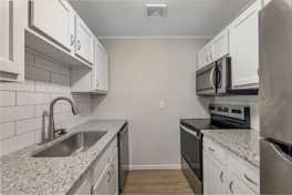 ✔️ Sleek galley-style kitchen with granite countertops, stainless steel appliances, and updated cabinetry