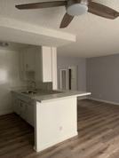**This One-bedroom is a contemporary space featuring stainless steel appliances and new quartz counters with a stove and refrigerator. With new vinyl plank floors, large windows and an open floor plan with plenty of natural light, vertical blinds, and ceiling fans. Upgraded bathroom, vanity, and fixtures.
