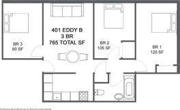 This is a three-bedroom apartment at 401 Eddy St. The living room has two couches and a coffee table. The kitchen has a pass-through window to the dining table set. The kitchen is equipped with ample counter space, several cabinets, and a microwave. Each bedroom has a double bed, a dresser, and a desk set. Every bedroom also has a large window which allows for plenty of natural light. There are three closets in this unit. The bathroom is large and includes a bathtub with mirrored shower doors. 24/7 recorded security camera suite from ADT.
