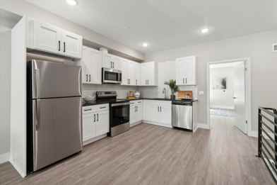 Modern Kitchen: Enjoy a sleek, open-plan kitchen with granite countertops and a complete stainless steel appliance package, including a refrigerator, microwave, stove, dishwasher, and dryer.