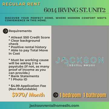 $970/ Month Requirements: * At least 550 Credit Score * Clear background check * Positive rental history * Able to pay Total Move In Cost * Must be working cause will be asking 2 or 4 paystubs (If not, as many proof of income as you can provide.) * 1 Photo ID * $4.99 Application Fee (Non Refundable)