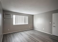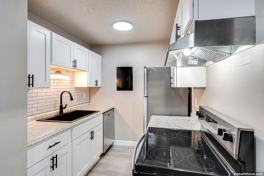 This unit features stylish brown cabinetry that beautifully highlights a spacious, open area.