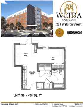 Weida on Waldron - 221 221 Waldron St is a rental apartment building with 15 floorplans available. It is located in West Lafayette. It has apartment amenities including furnished, high ceilings, dishwasher, microwave, in-unit laundry, and air conditioning.